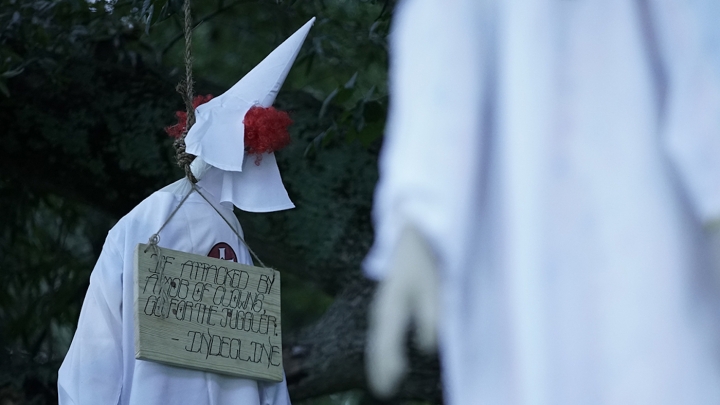 Lastly, a very recent work by the group aimed to shed light on the conflict of “white nationalists, neo-Nazis, and other hate groups” seen in Charlottesville, Virginia this past summer. INDECLINE dressed up eight fake clowns in KKK uniforms and hung them by the neck on a tree located in a park where a former slave rebellion took place. While this installment does not provide a solution to the issues of recent events, it certainly serves as a warning. The representation of these white nationalists as clowns, portrays them and their values as a joke. An article from Hyperallergic Media quotes a member of INDECLINE and reveals that the group hopes to show that “these racist movements are so small compared to those opposing them” this shows a call to action for such ‘opposing groups.’ Additionally, it is no doubt that updated technology and widespread social media helped this group gain a more significant following, and due to this, their recent works have been highly and carefully documented and posted on their website under the “flicks” link. The flick for “Ku Klux Klowns is especially effective because it is accompanied by a pro-kkk song featuring lyrics such as “Stand up and be counted, Go with the Ku Klux Klan!” This ironic song choice makes a joke of and weakens the influence of white nationalists and therefore makes the message from INDECLINE that much stronger. INDECLINE has mastered the art of controversial and short-lived art. The combination of these two things have made this group successful in their goal of drawing attention to a movement to rise up against social norms.