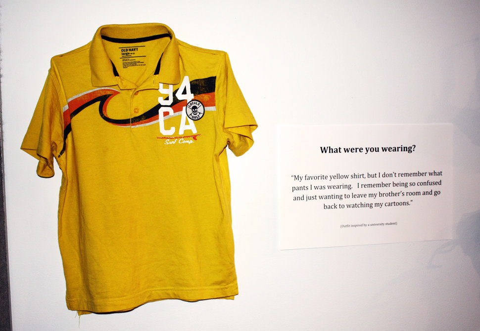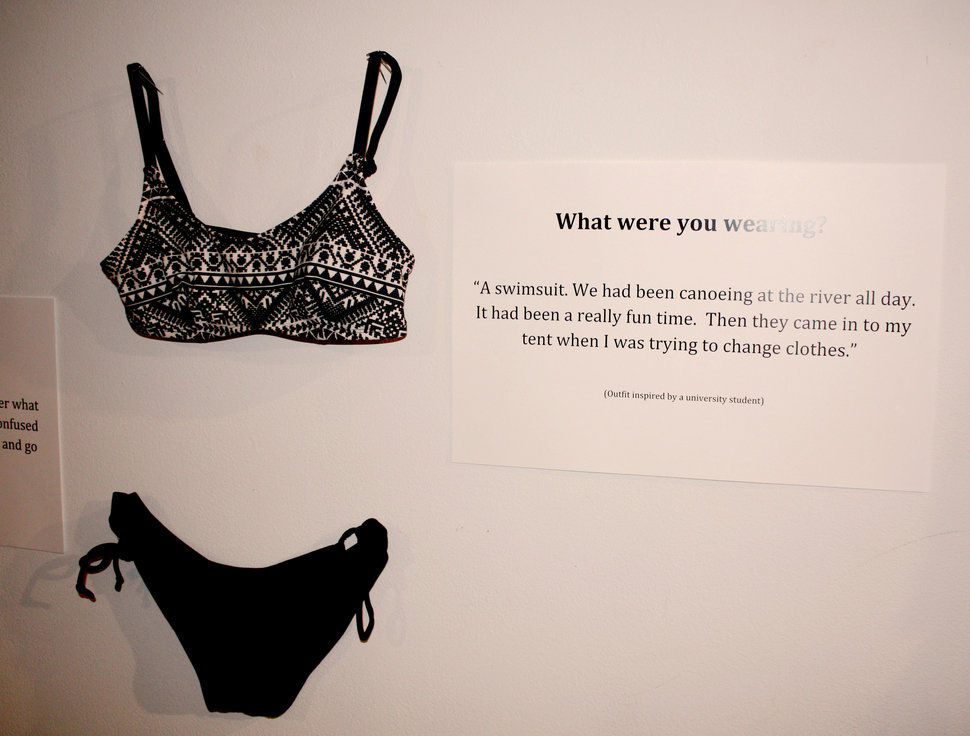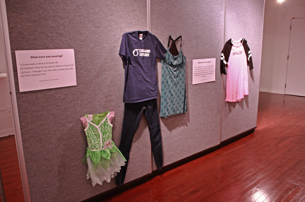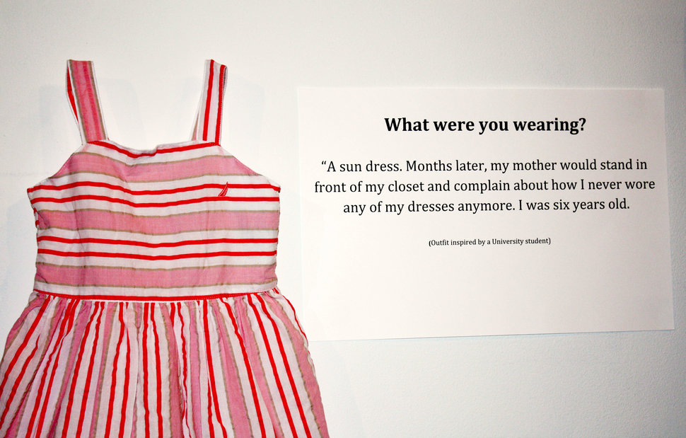 I agree that this is an incredibly powerful art exhibit, turning on the commonly questioned “what were you/she/they wearing?” It flips away the idea that someone who dresses a certain way is asking to get raped, and instead shows how the problem wasn’t what a victim was wearing, but rather that there are people who prey on others. The little children’s dress next to the sports clothes really show that the accusatory ‘What were you wearing?” is not the question we should ask those that have been sexually assaulted.