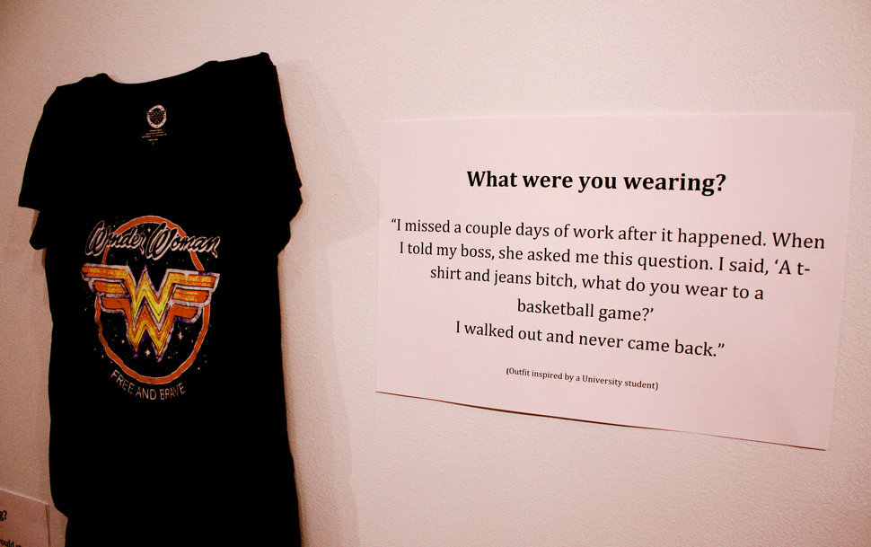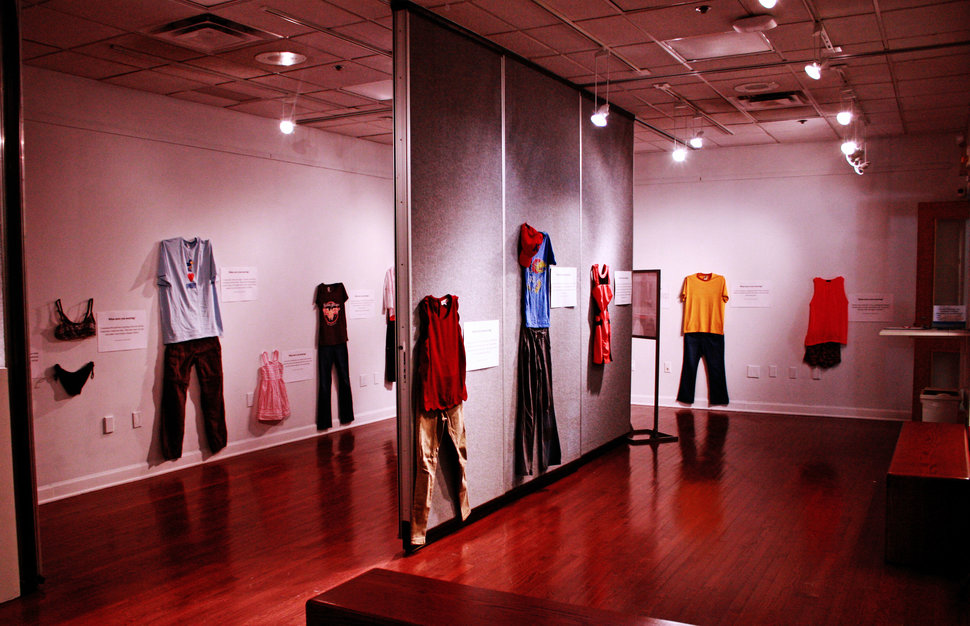 The art exhibit showcases the exact outfit an individual wore when they were sexually assaulted. This art exhibit aimed to extinguish the idea that women must be dressed whorishly to be sexually assaulted. The clothes are placed with a direct quote from the survivor explaining the outfit. Some outfits are from childhood sexual assault victims which show a loss of innocence at such a young age.