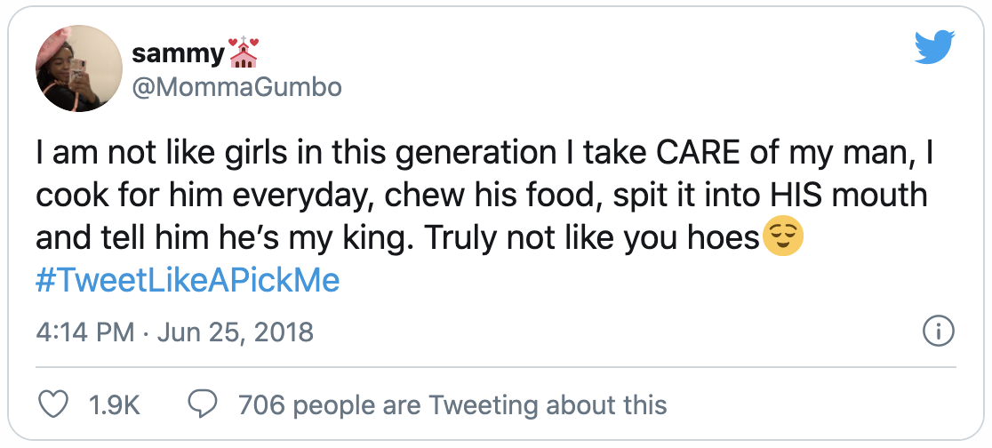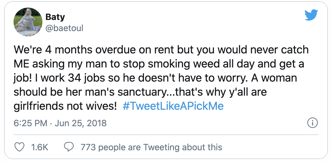 While most Pick Me Girls are seen as those who stray from the feminine agenda, they include women who slut-shame others or bash women who do not put their significant other (usually a man) above everything else. The hashtag “#TweetLikeAPickMe” parodies the attitude of Pick Me Girls by exaggerating views on how women “should” act. There are also many songs created that exemplify Pick Me energy, including “You Belong With Me” by Taylor Swift, which practically begs the male subject of the song to leave his girlfriend to be with the narrator. Another song that is representative of a Pick Me is “Hide Away” by Daya, which has been called controversial for slut-shaming lyrics.