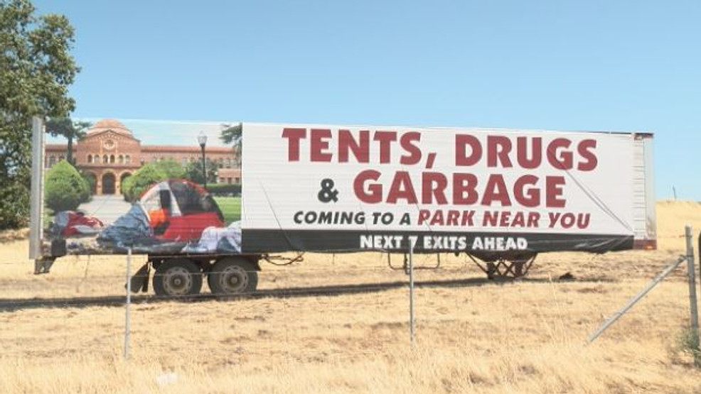 A second sign on the side of a semi made an appearance a few months later – not so much targeting the NVHRC and their work – but the people who benefit from them. “Tents, Drugs &Garbage coming to a park near you” boasts the results of the needle exchange program from the point of view of Chico residents and business owners who only see an increase in discarded, used needles and syringes around town. Another familiarity twisted to change the original intended use enough to shock and grab the attention of the audience. A clueless traveler looking for a quick pit stop could be instead thrown in the middle of a local squabble between business owners and a do-good organization.