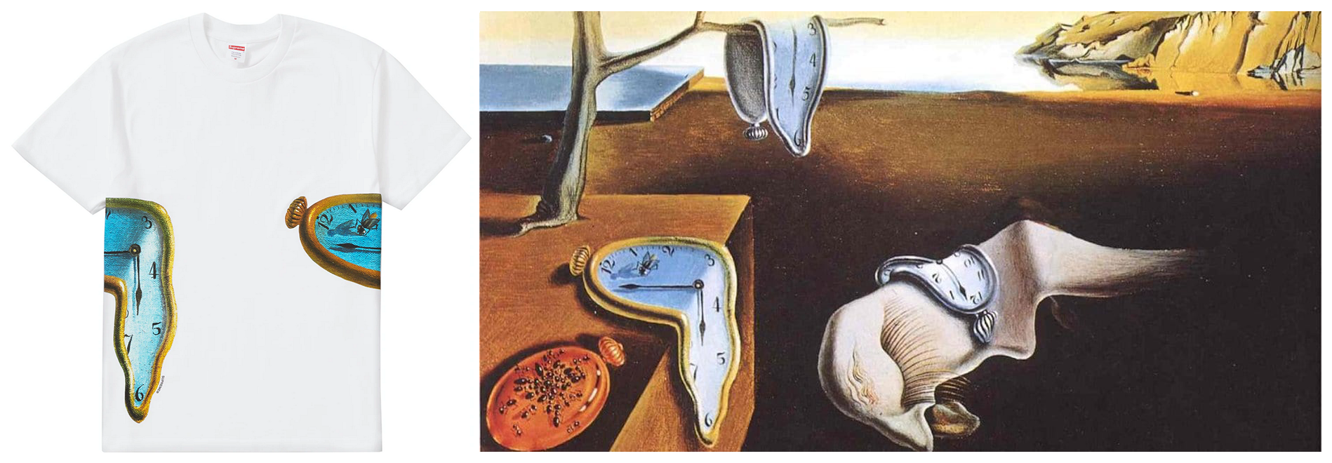 What’s more, is that many of the pieces sold by Supreme are obvious copies of original artwork. A prominent example was seen just a few years ago when the company used the Farmland Foods logo and design and simply replaced the text with “Supreme.” Of course, when they released this product it sold out almost immediately and they never acknowledged that they had ripped this logo and design from another business. Other instances include the use of elements from Salvador Dali’s renowned painting The Persistence of Memory. Here we can see that Supreme utilizes the melting clocks from this painting with no credit or compensation to the original artist.