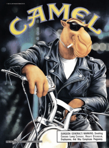 Joe Camel was a marketing campaign for Camel cigarettes that initially began in Europe in 1987. Joe was introduced to the United States in 1988 in celebration of Camel’s 75th anniversary campaign. So, now this mascot is entering the market, catching the attention of new, younger consumers. As seen throughout the history of tobacco in the United States, children and young adults are always interested in whether their favorite celebrity, pop star, or athlete is smoking some new, hip thing. With Joe Camel, kids had a unique type of figure. One that could do no wrong, a fictive man-camel that is always possessing perfect swagger, the Camel cigarette image.